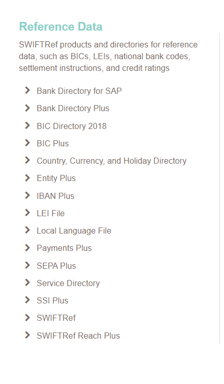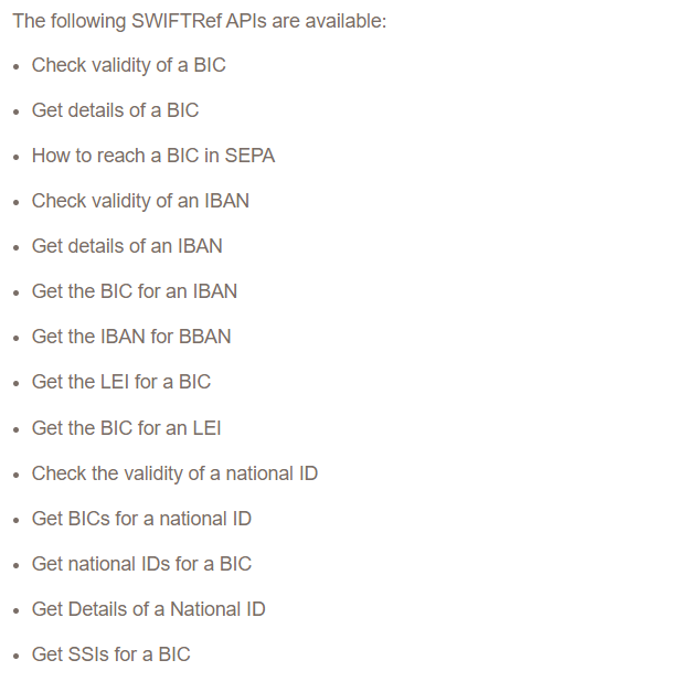 SWIFTRef is SWIFT’s unique reference data and financial information utility. Sourced from authorised data owners, SWIFTRef includes the most accurate reference data covering BIC, LEI, IBAN validation, national bank codes, standing settlement instructions, credit ratings and financial information.